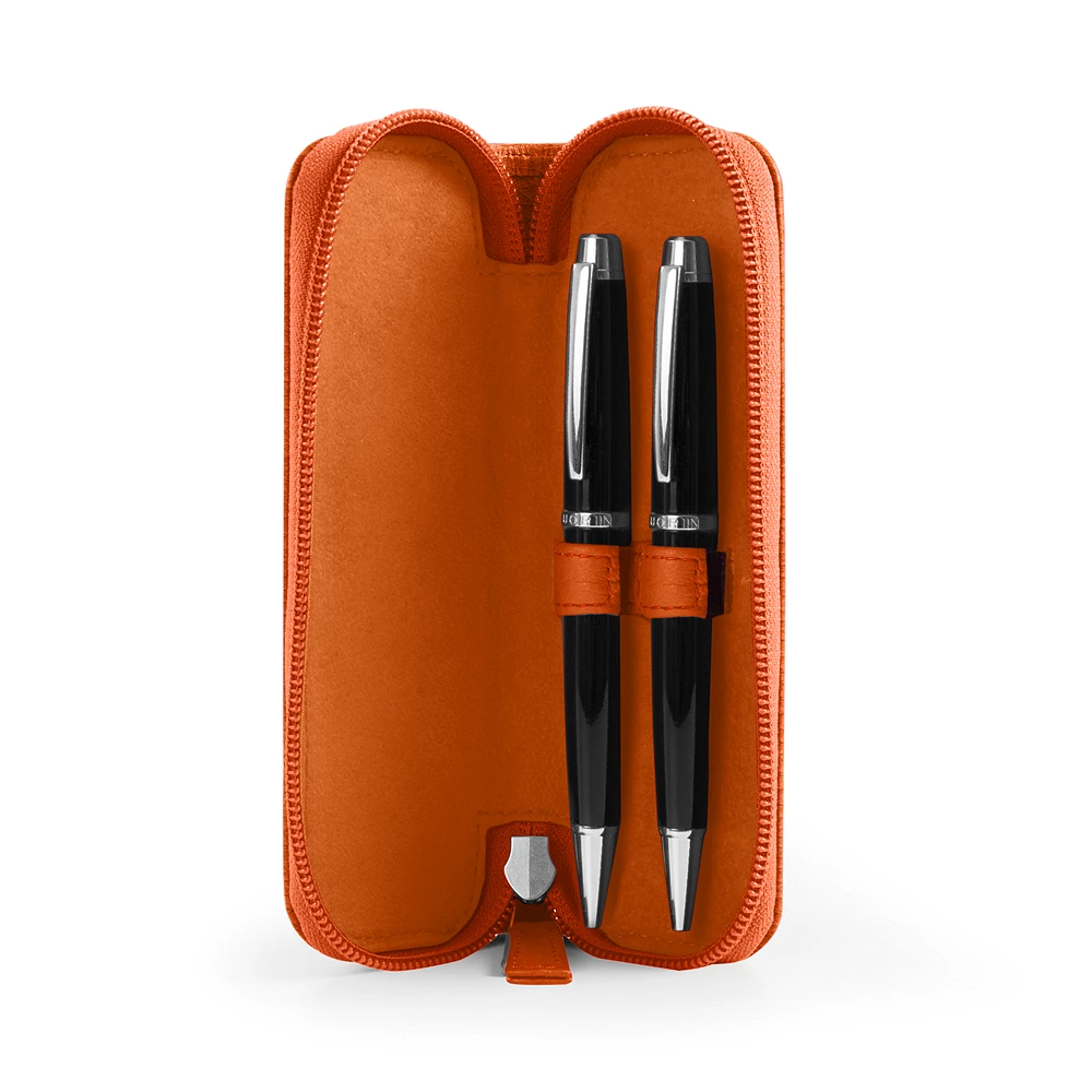 Zipped Case - 2 Pens Orange  - Pebbled Leather