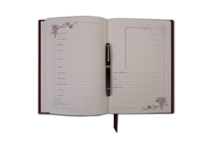Cellar book for 77 vintage years, available in French only. This book enables you to organise your cellar efficiently, noting down all the information necessary for its good management. To the right, there are sections for the region of origin, grape variety or château, appellation, producer, supplier, year, purchase price, date of entry, quantity of entry, remainder in cellar, maturity and notes on serving. On the left, there is a space for sticking the bottle label, the date of tasting, where and with what this was done, and comments on the wine. The book has a leather strip that serves as a bookmark.