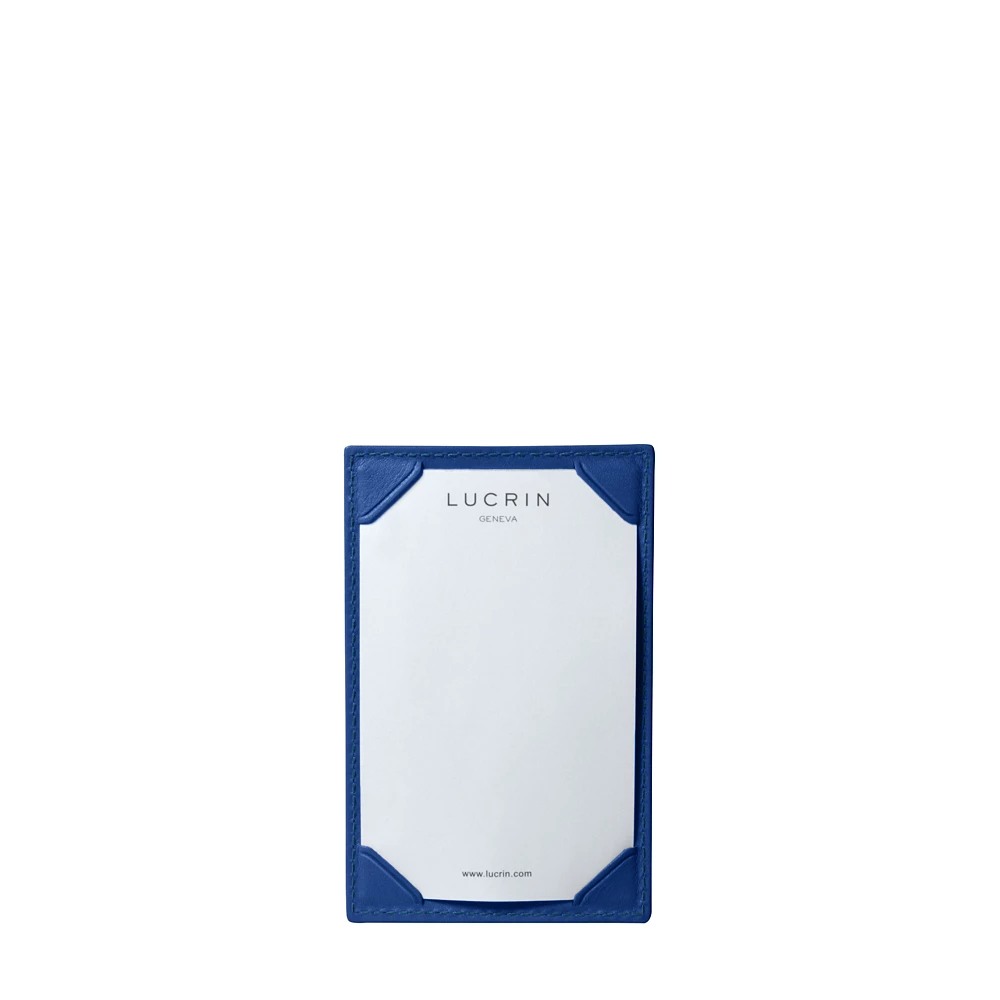 This writing pad, which is really not bulky in terms of size, is ideal to jot down notes, thoughts or phone numbers. On one side, you have the basic writing pad, where the sheets are held by 4 notched corners. On the other side, you have a slit in which you can slip in some paper refills or any card with standard credit card dimensions. Of course, all our writing pads are delivered with white LUCRIN sheets coming in some paper blocks refills.